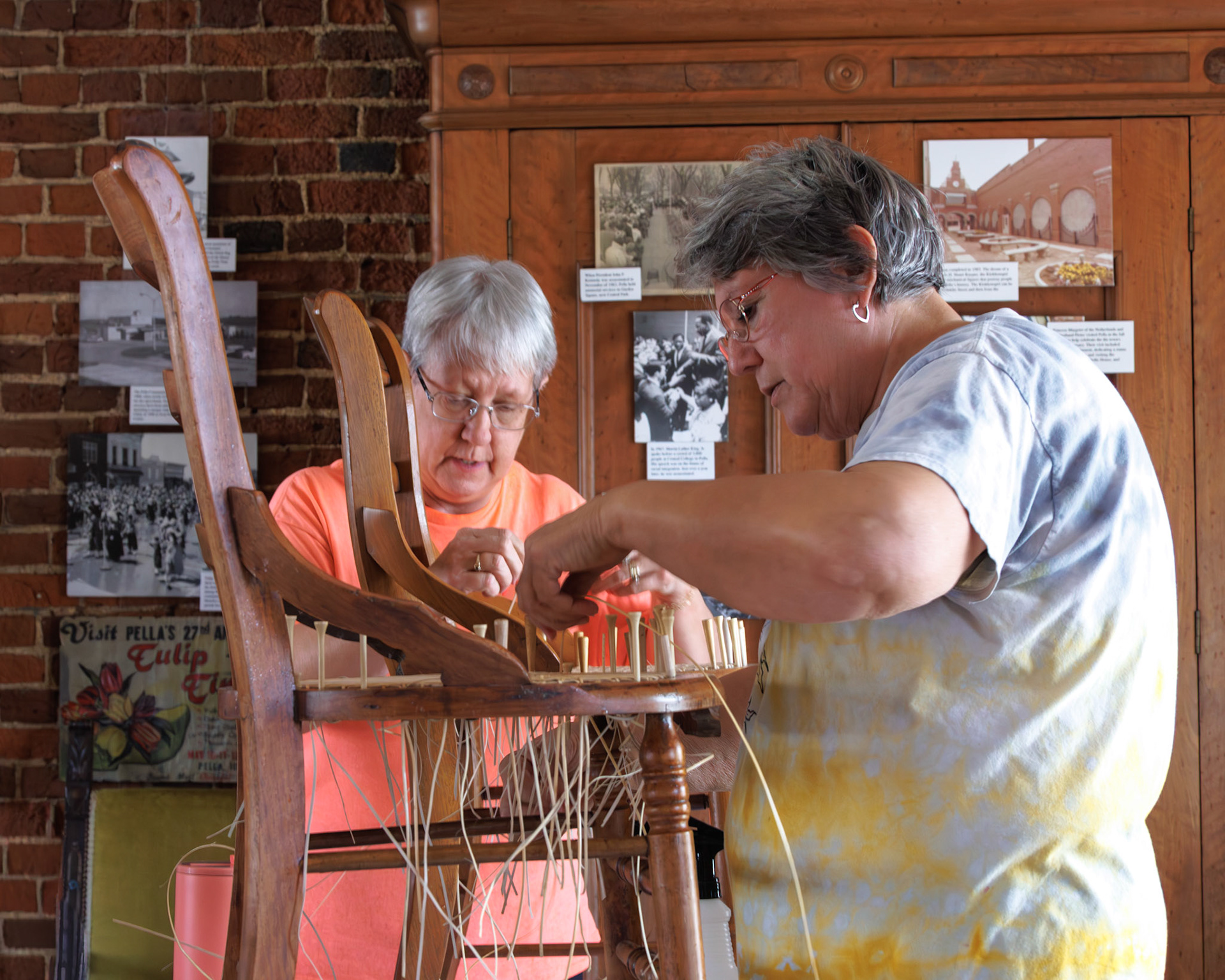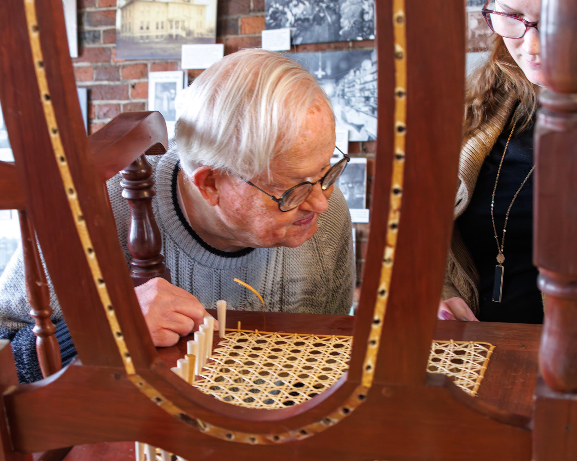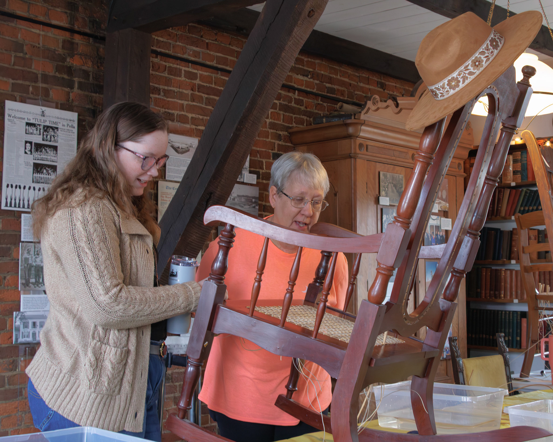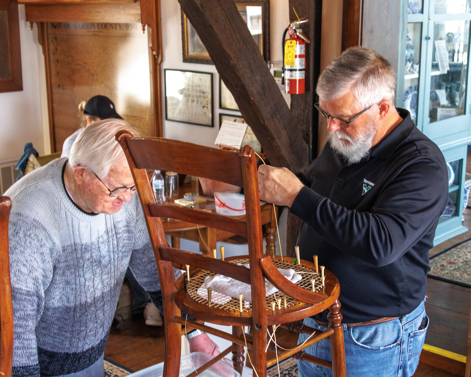 Pella Historical Museum's Windmill Winterim, where the traditional craft of chair caning is being taught by the skilled Gene Newman to his students.