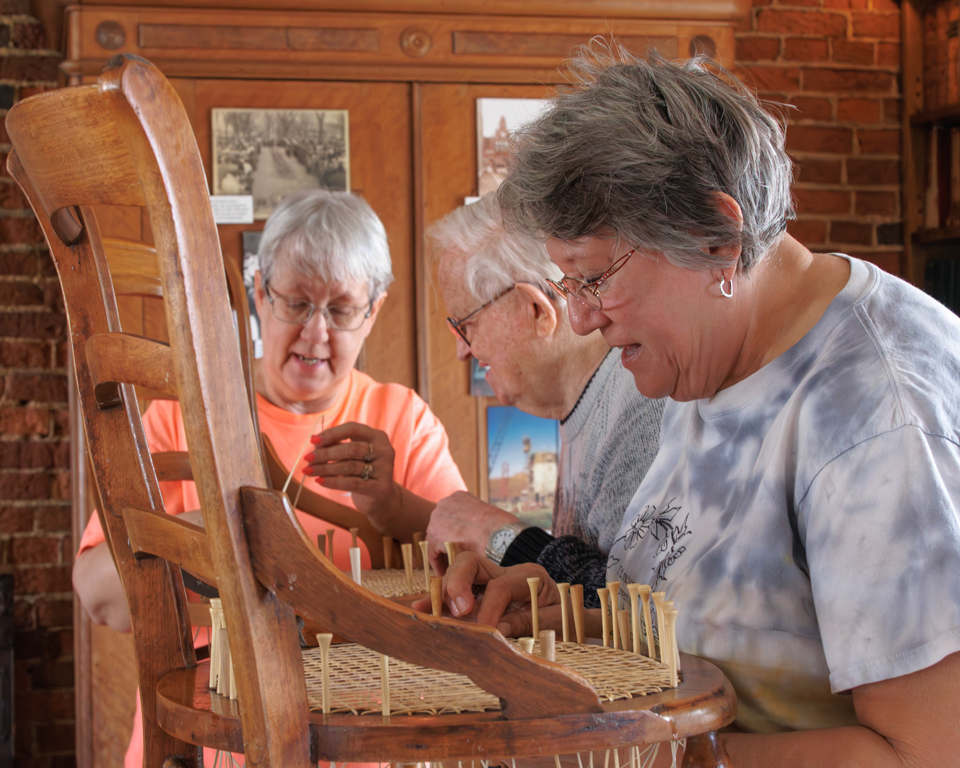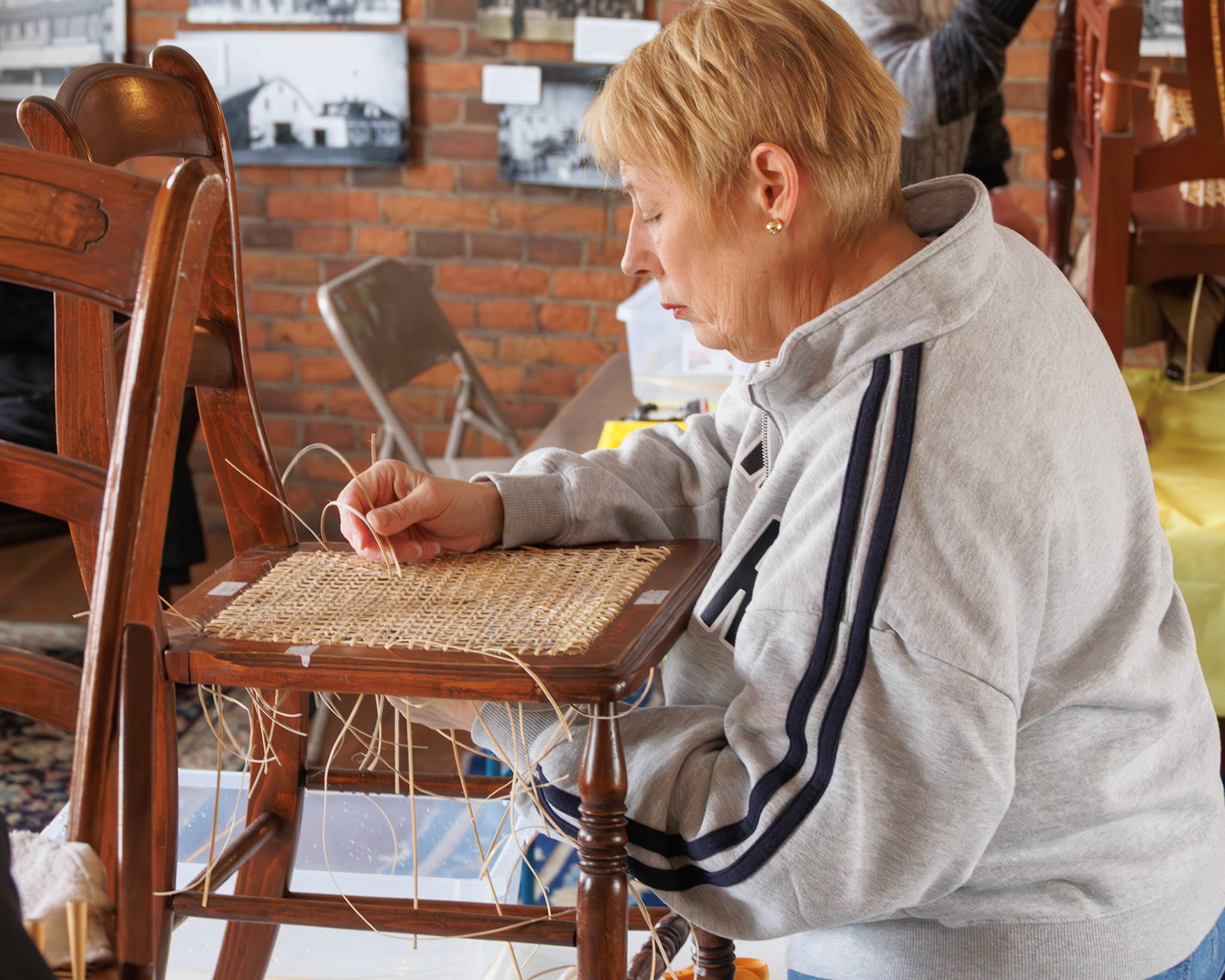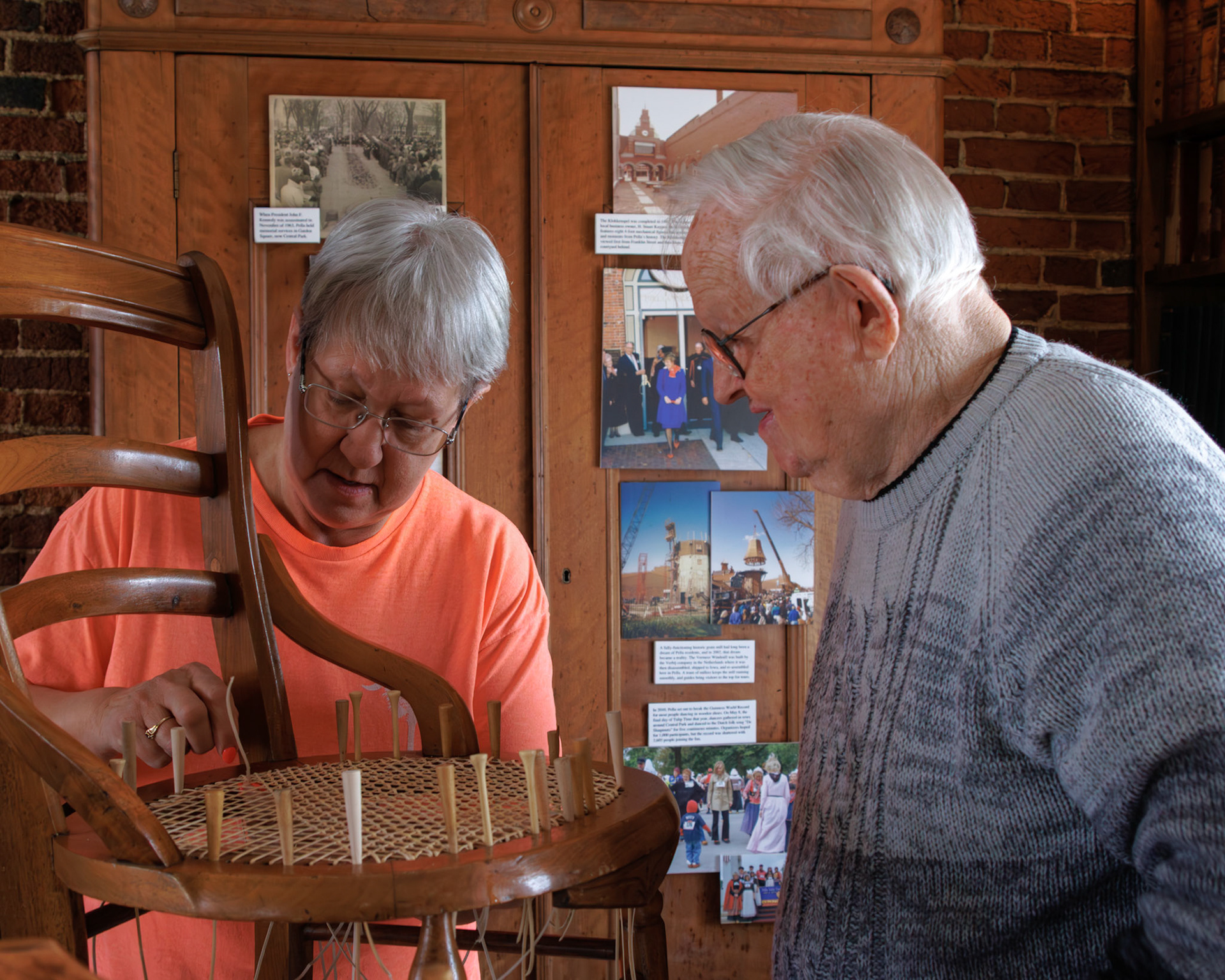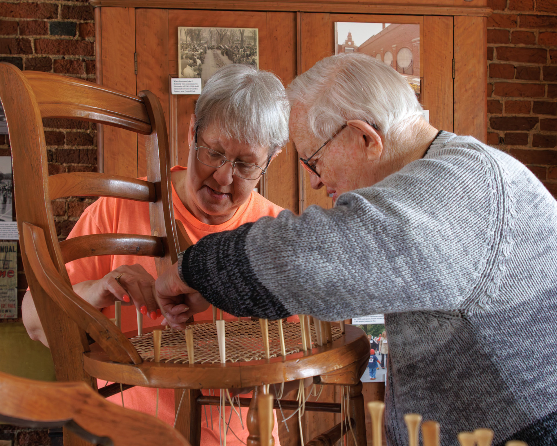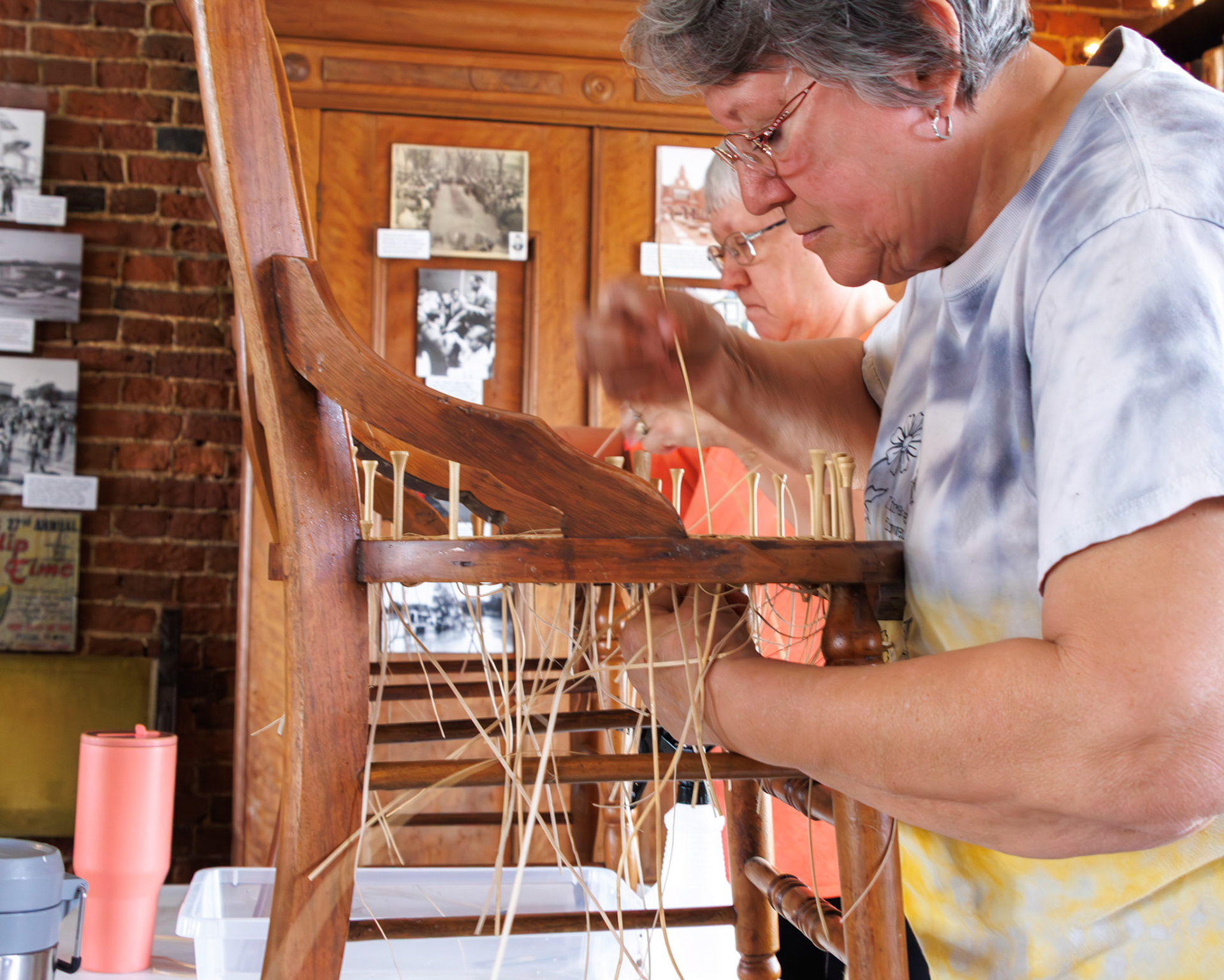 Pella Historical Museum's Windmill Winterim, where the traditional craft of chair caning is being taught by the skilled Gene Newman to his students.