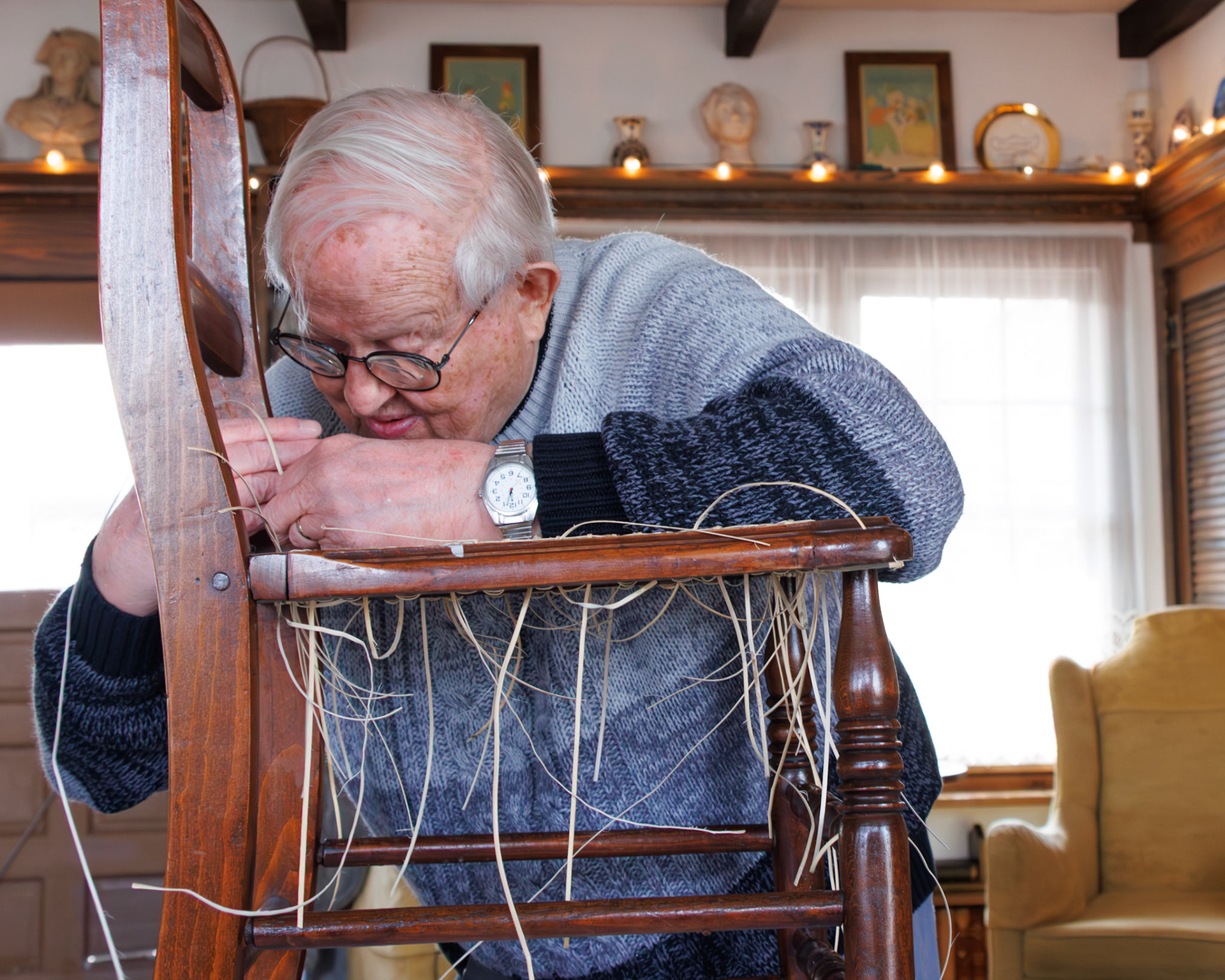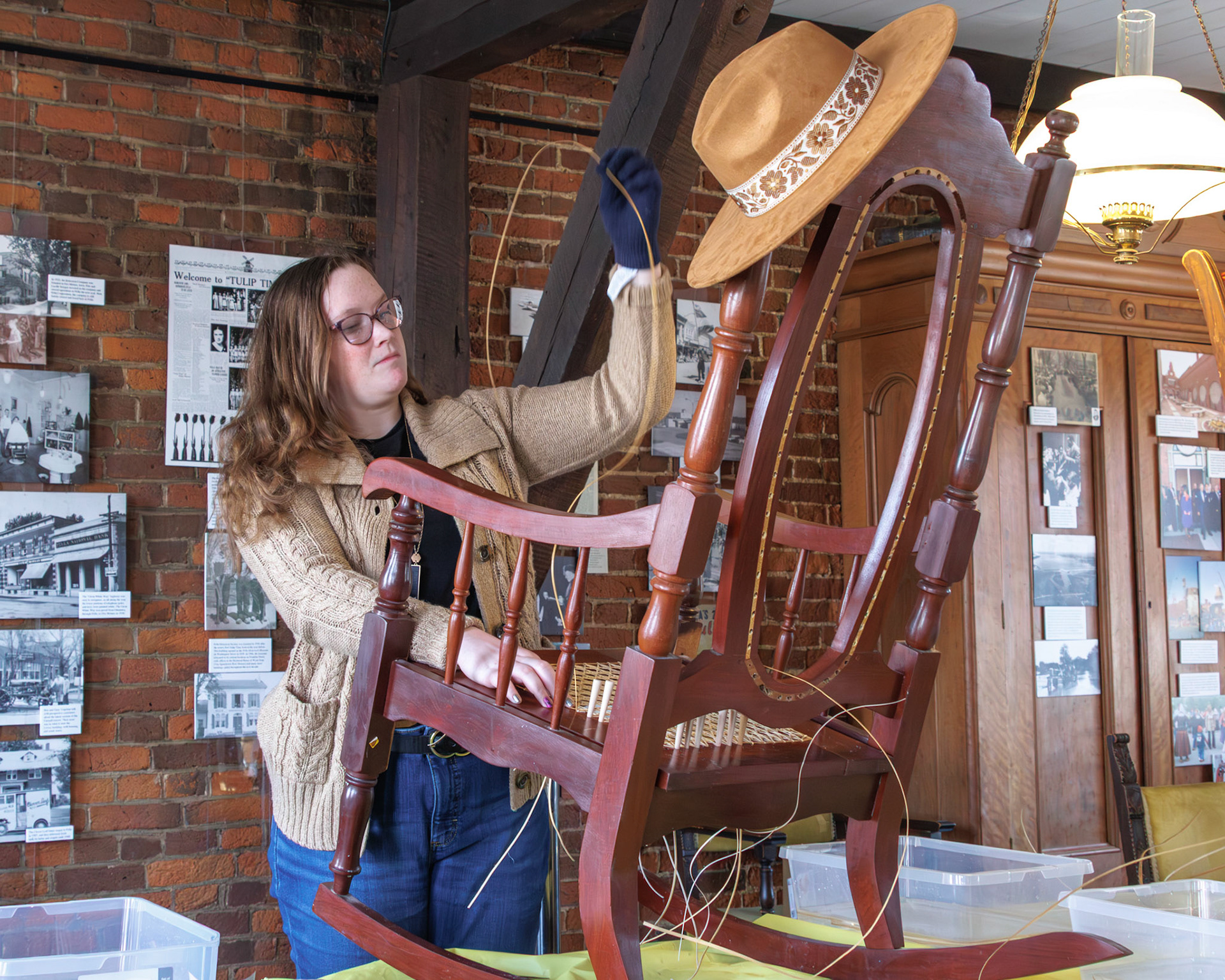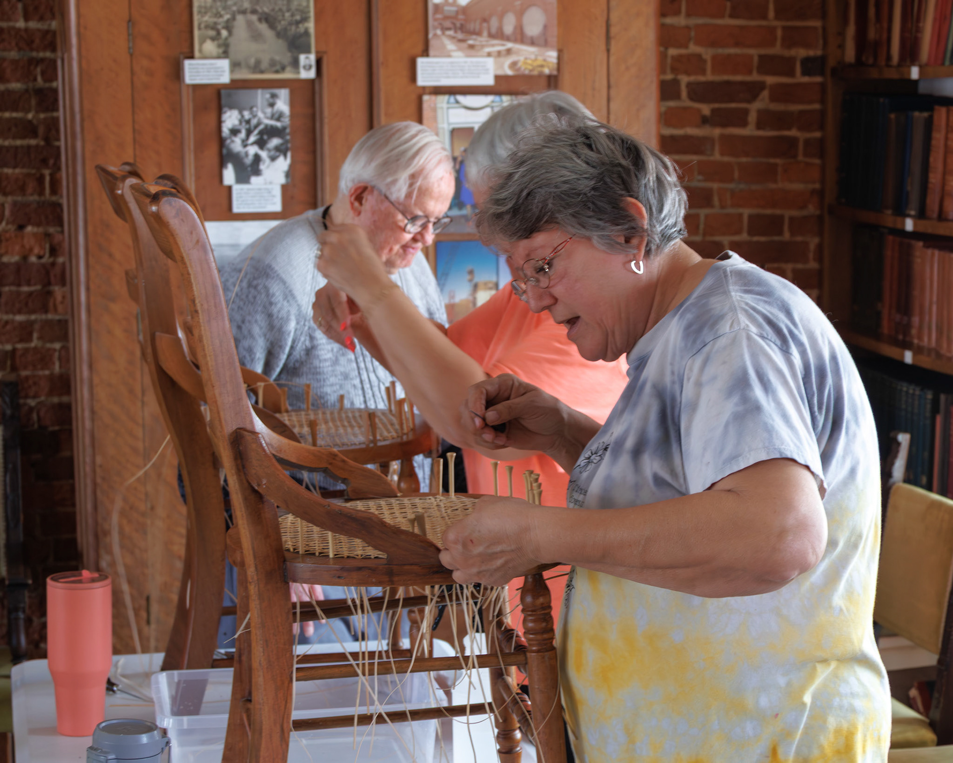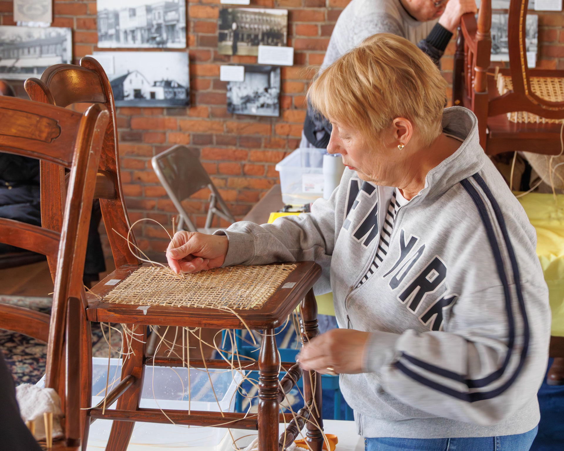 Pella Historical Museum's Windmill Winterim, where the traditional craft of chair caning is being taught by the skilled Gene Newman to his students.