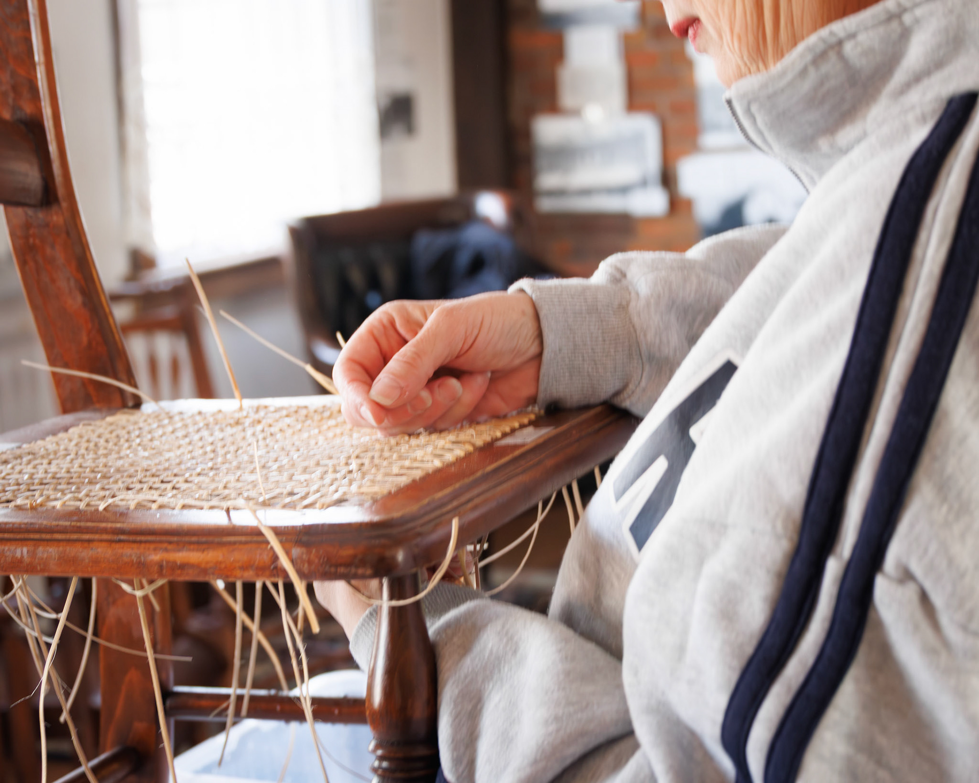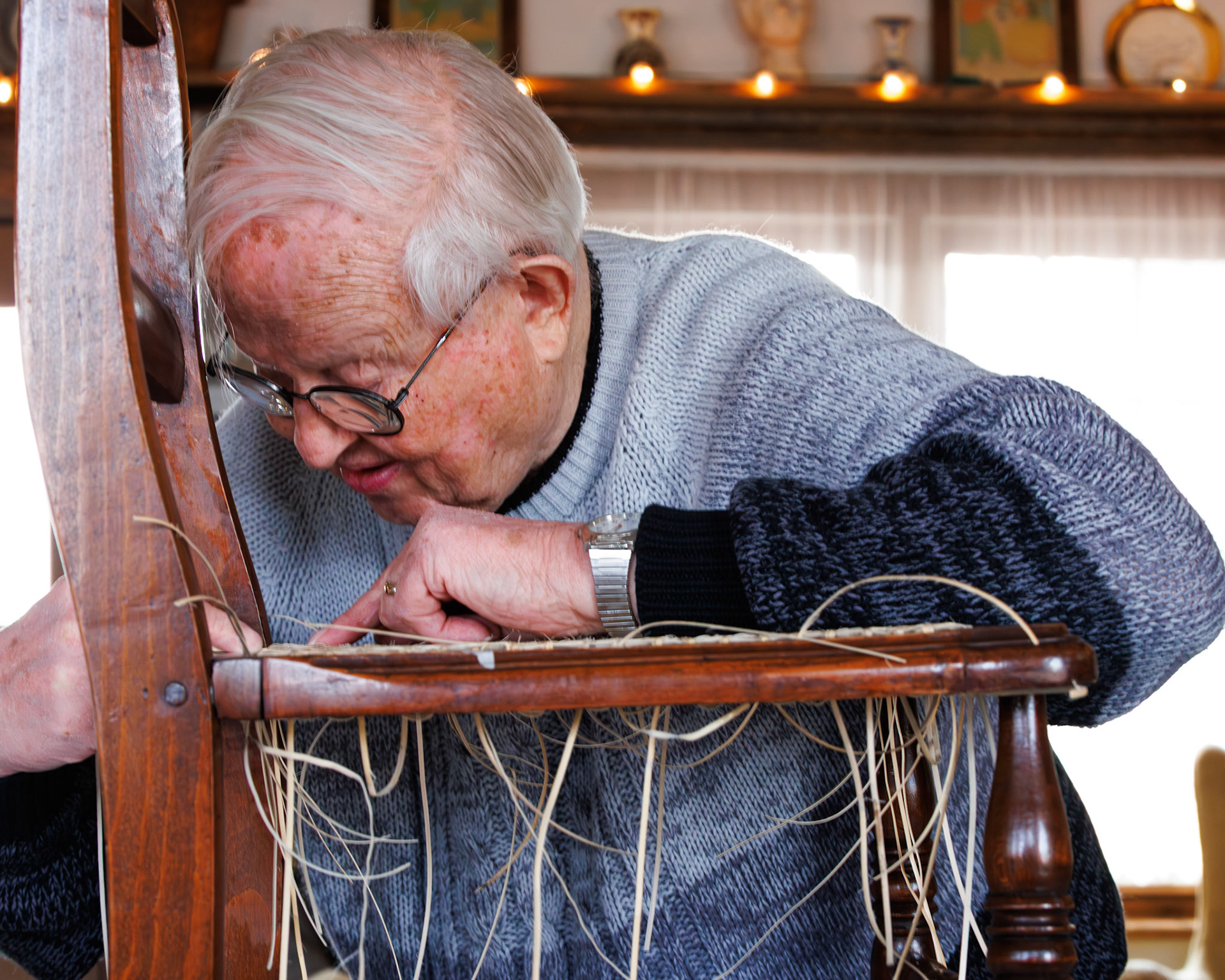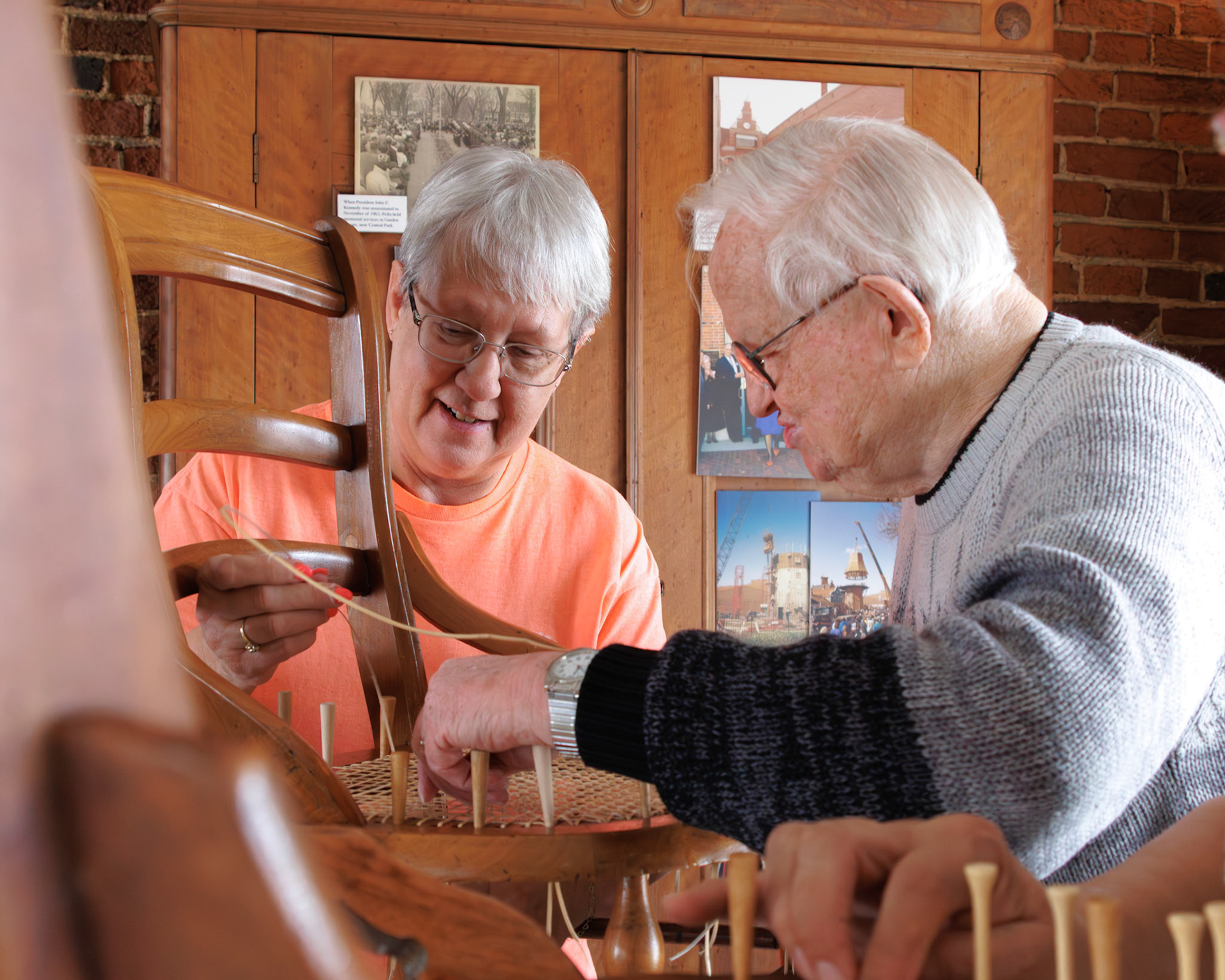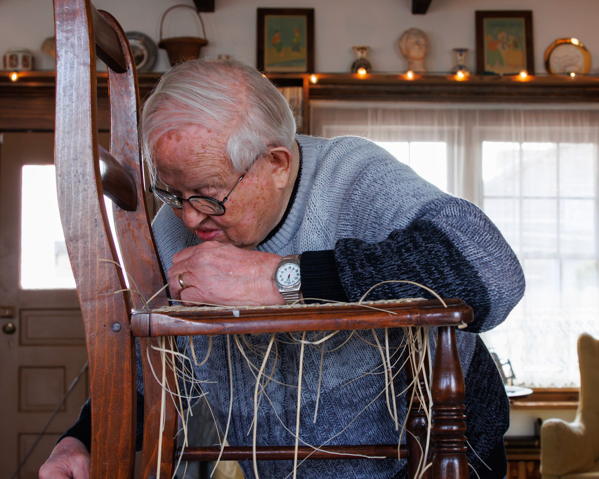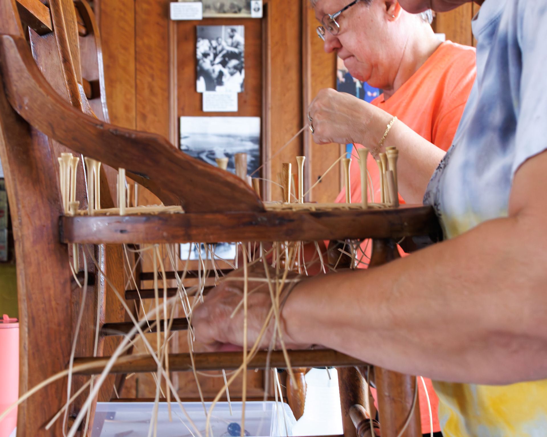 Pella Historical Museum's Windmill Winterim, where the traditional craft of chair caning is being taught by the skilled Gene Newman to his students.