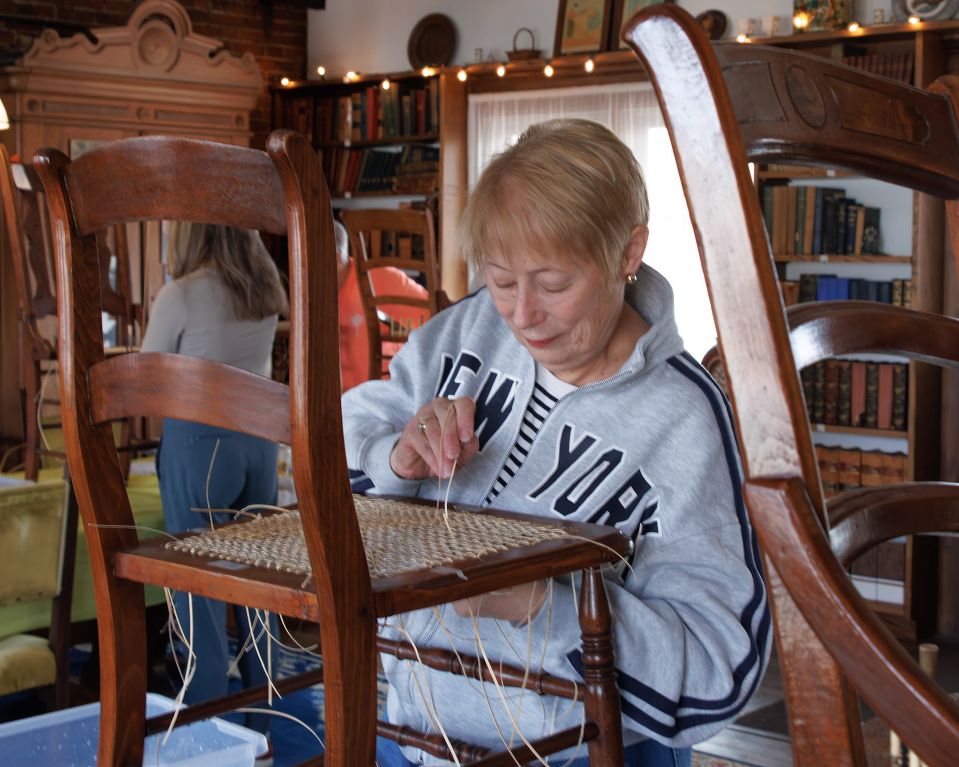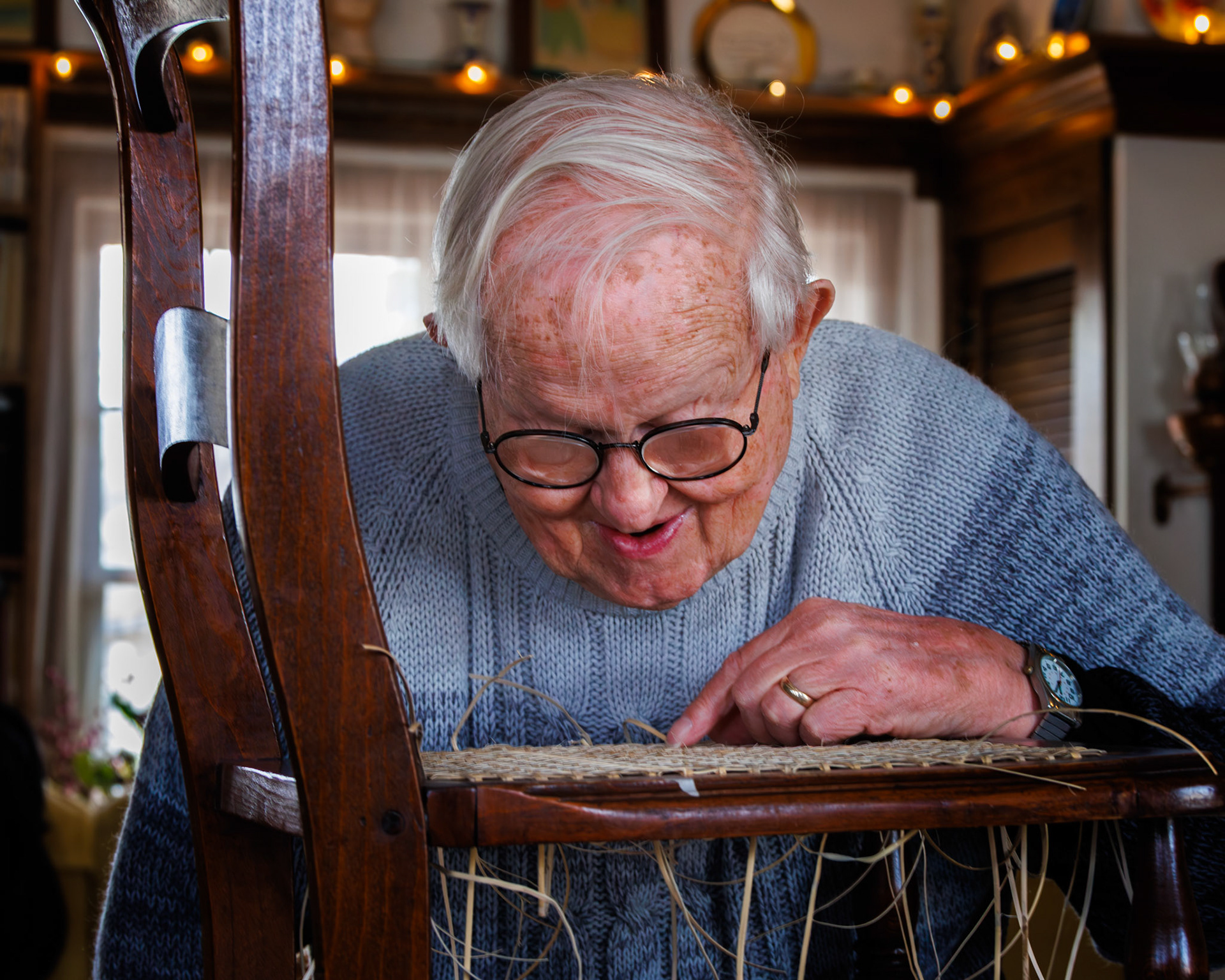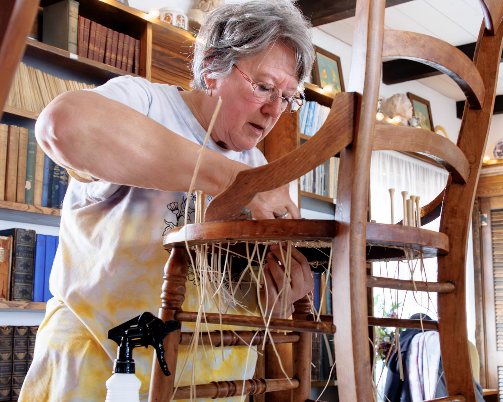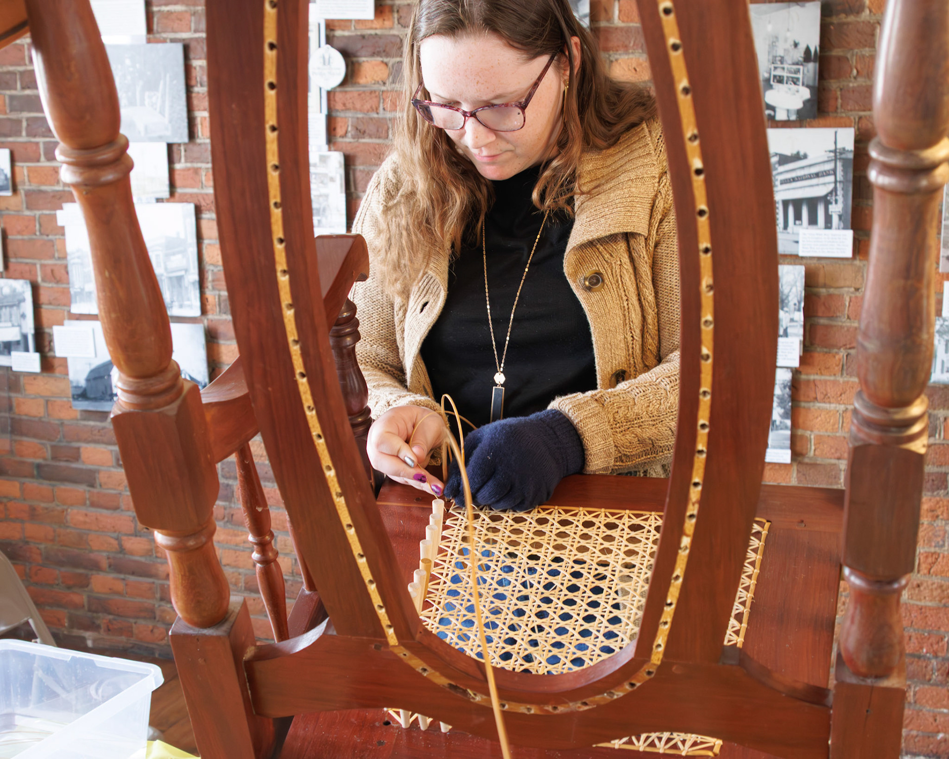 Pella Historical Museum's Windmill Winterim, where the traditional craft of chair caning is being taught by the skilled Gene Newman to his students.