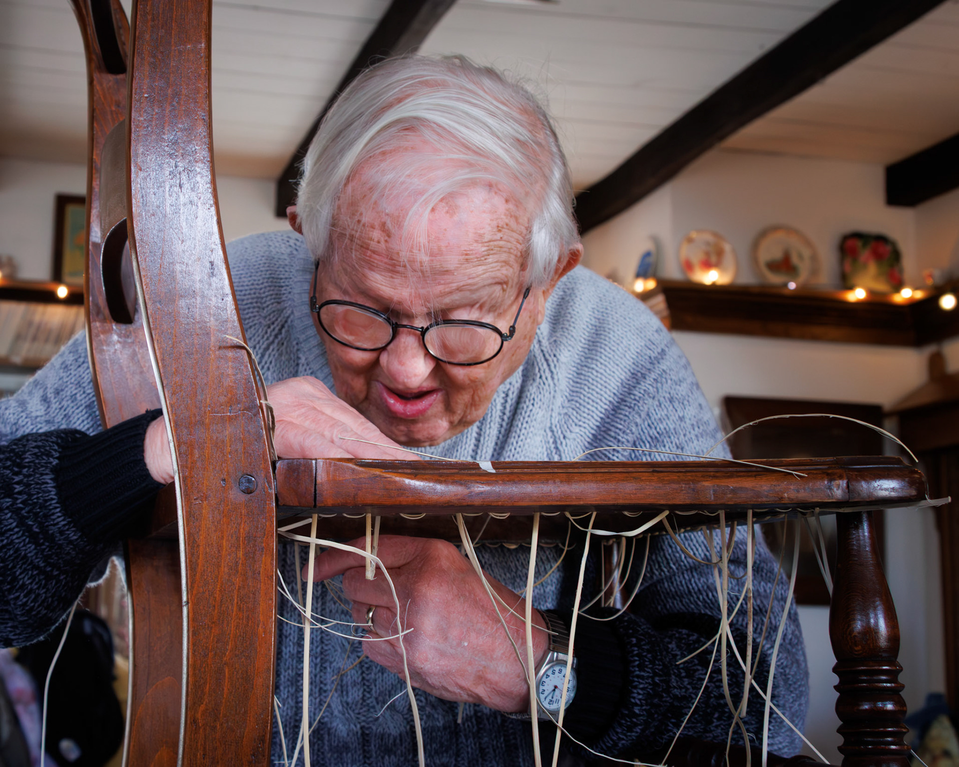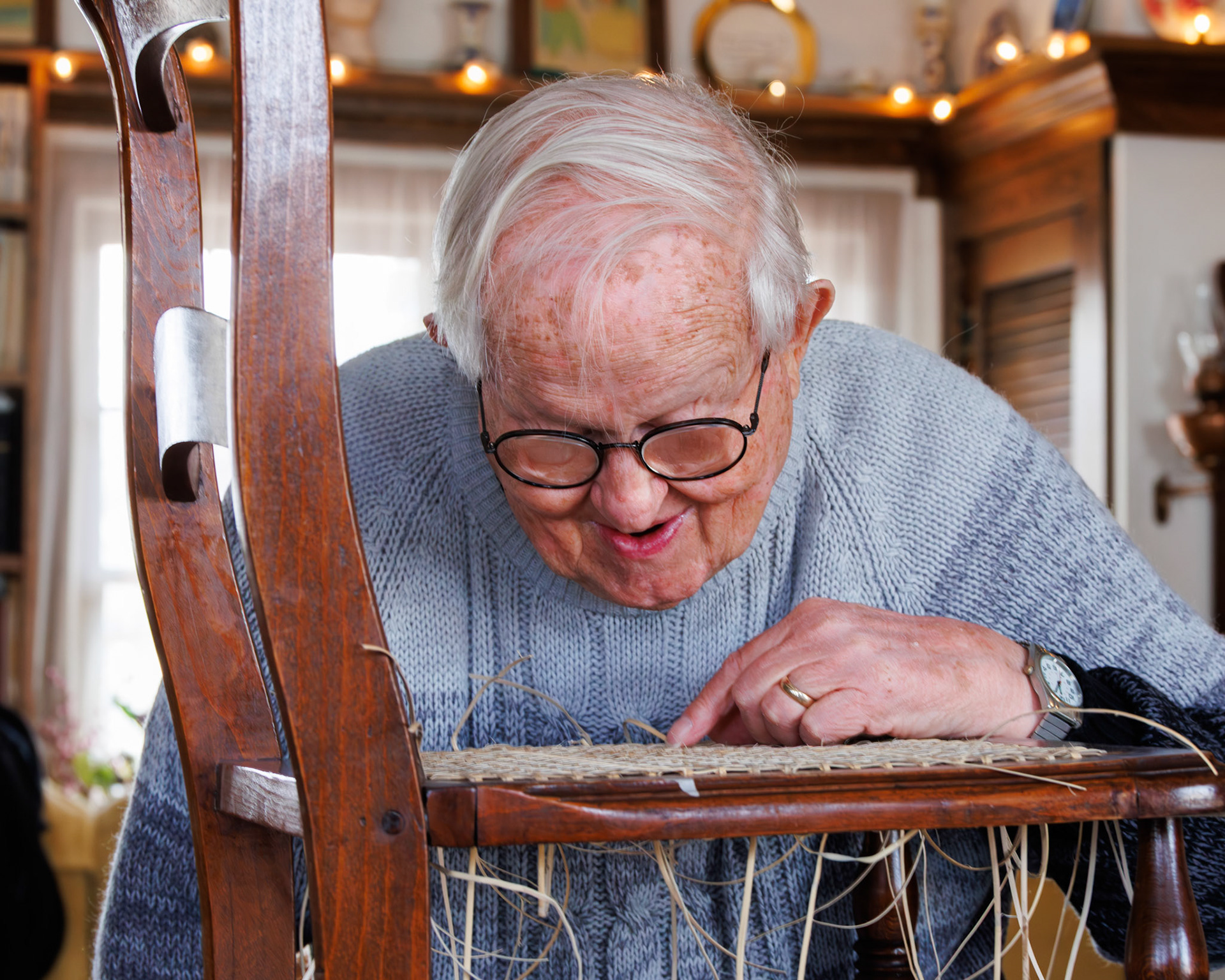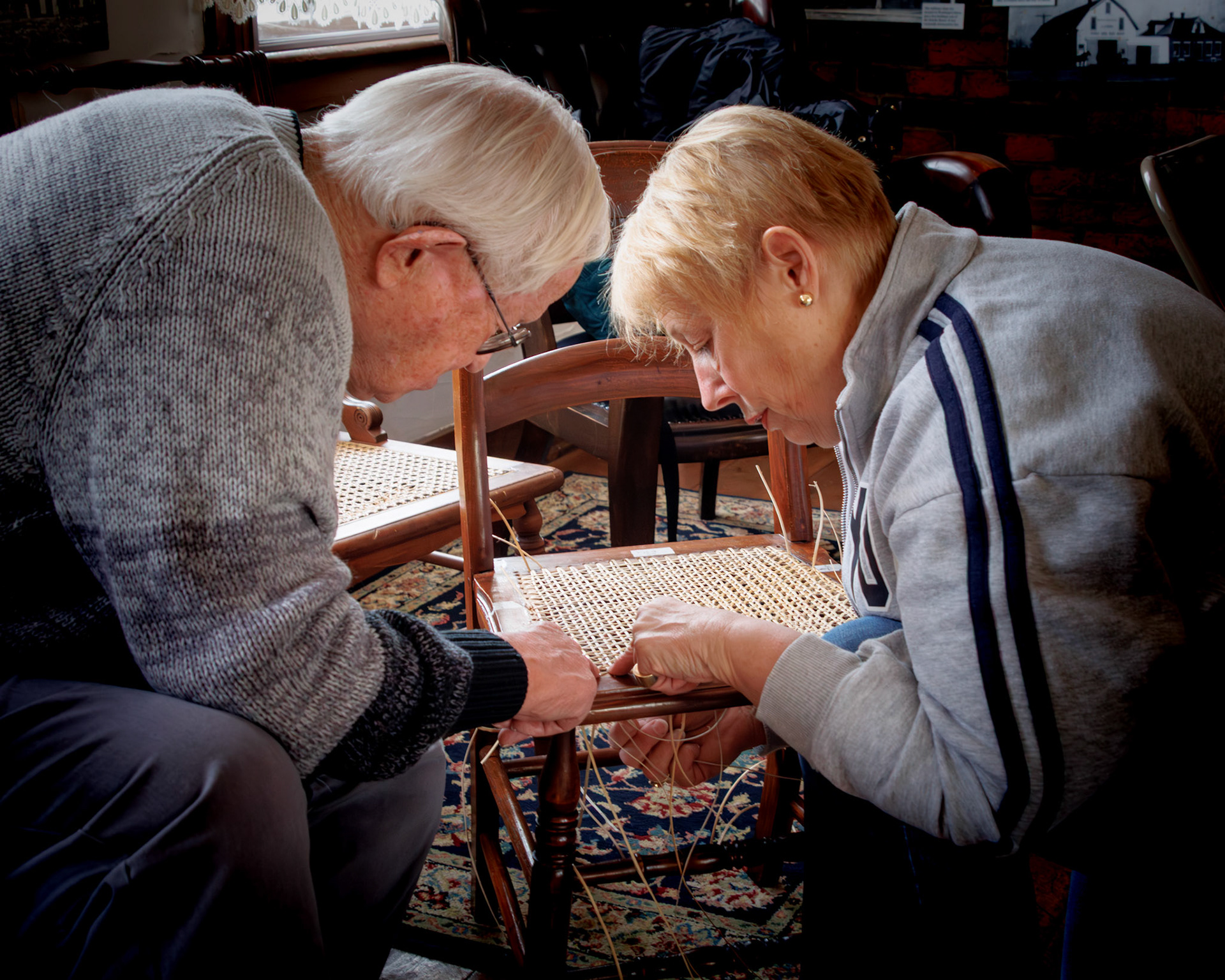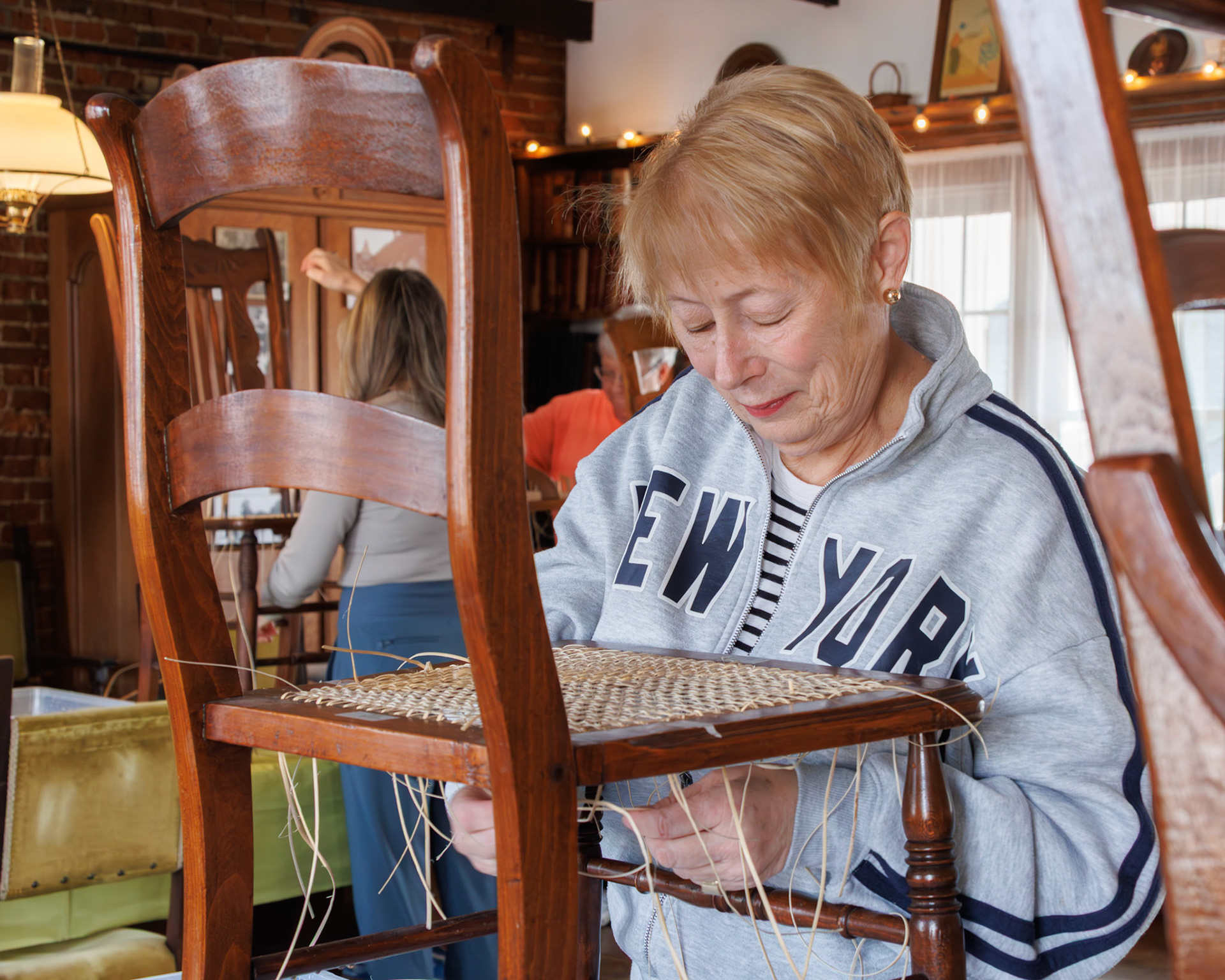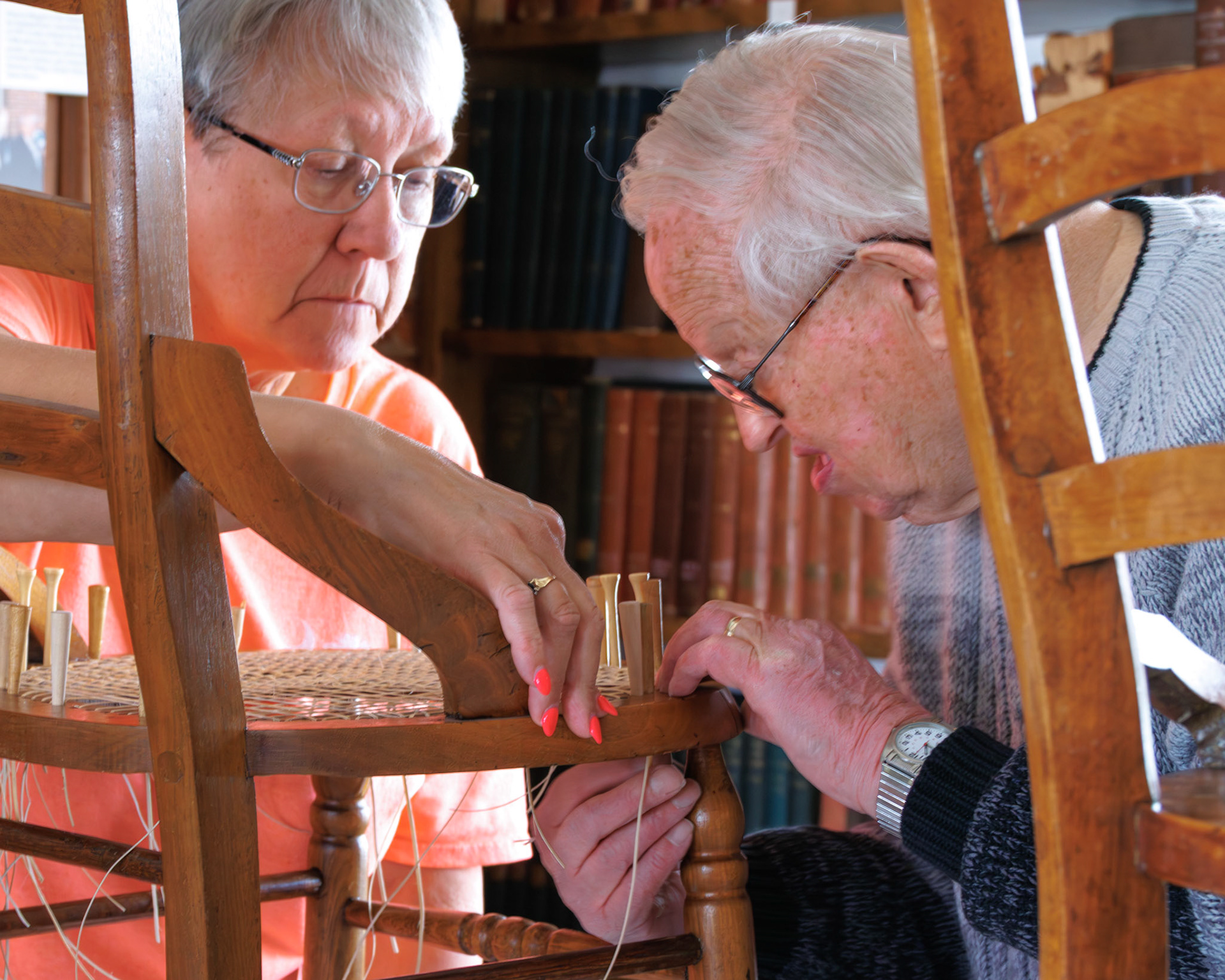 Pella Historical Museum's Windmill Winterim, where the traditional craft of chair caning is being taught by the skilled Gene Newman to his students.