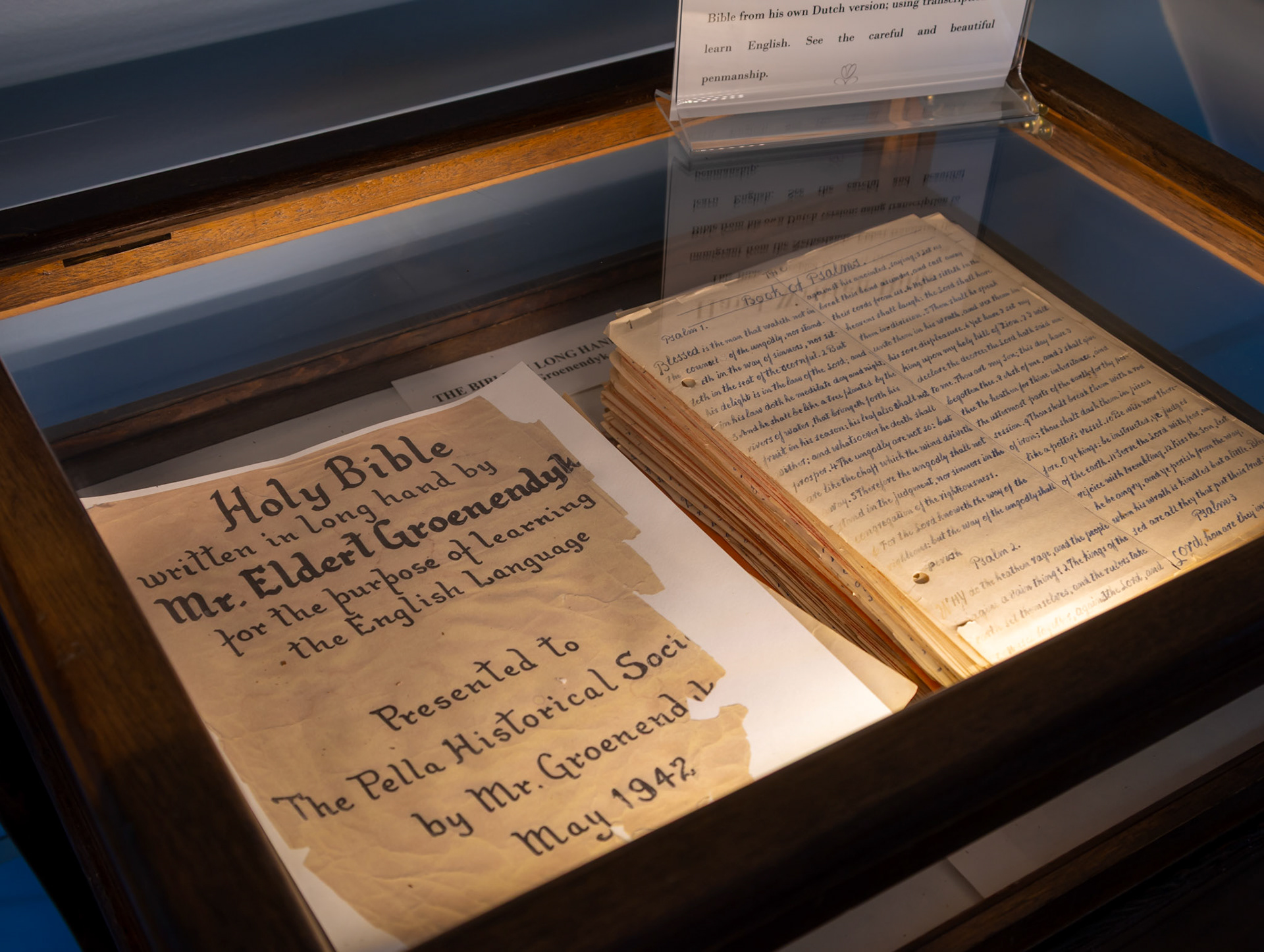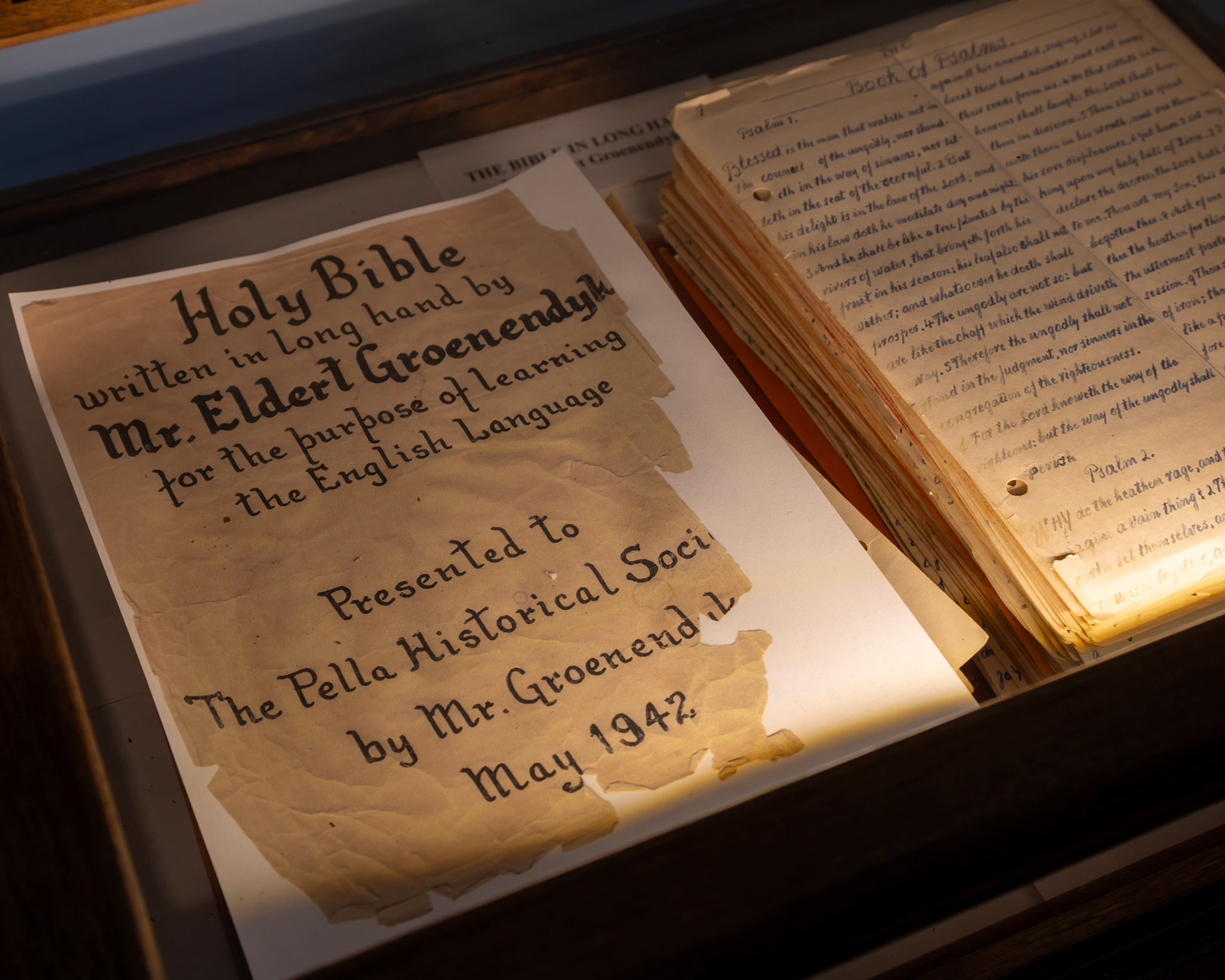 Showcased in the Viersen Parlor within the Historical Village, this Bible was hand‑copied by Eldert Groenendyke, an immigrant from the Netherlands. He translated it from his own Dutch Bible, using the act of transcription as a way to learn the English language.